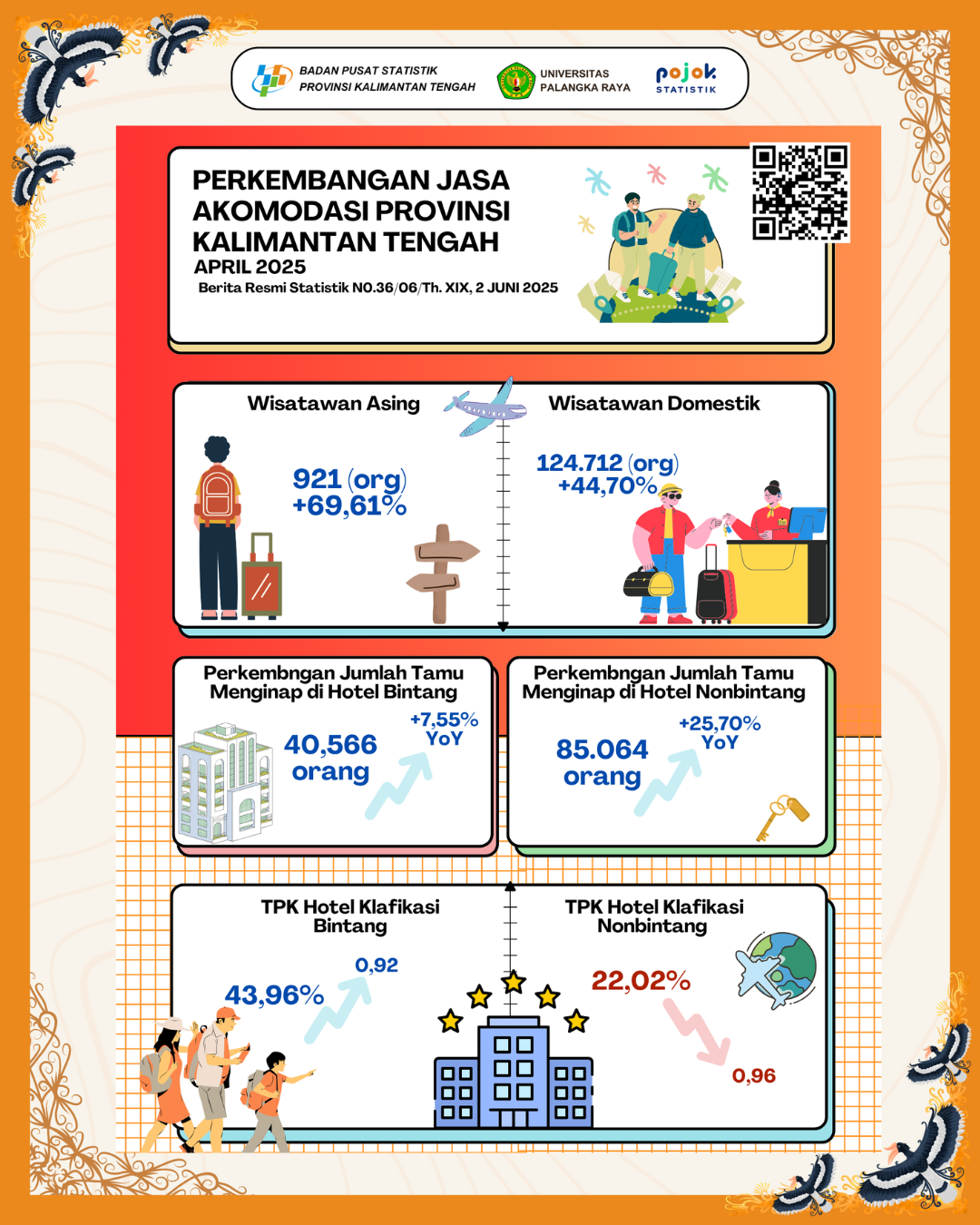 Perkembangan Sektor Akomodasi Kalimantan Tengah April 2025 Data statistik menunjukkan pertumbuhan positif sektor pariwisata dengan wisatawan asing mencapai 921 orang (+69,61%) dan wisatawan domestik 124.712...