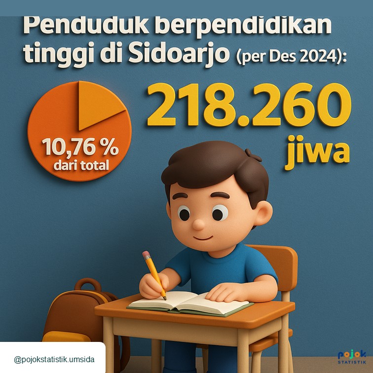 Penduduk berpendidikan tinggi (per Des 2024): 218.260 jiwa atau 10,76 % dari total sidoarjokab.bps.go.id +3 databoks.katadata.co.id +3 janti.desa.id +3 , dengan rincian: S1: 167.930 orang...