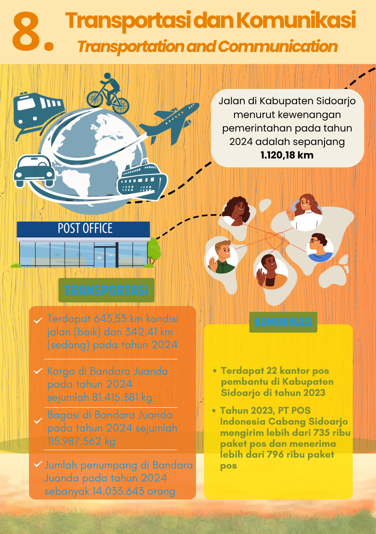 🚗✈️📦 Transportasi dan Komunikasi Kabupaten Sidoarjo, 2024 Pada tahun 2024, Kabupaten Sidoarjo mencatat total panjang jalan menurut kewenangan pemerintahan mencapai 1.120,18 km. Dari total tersebut,...