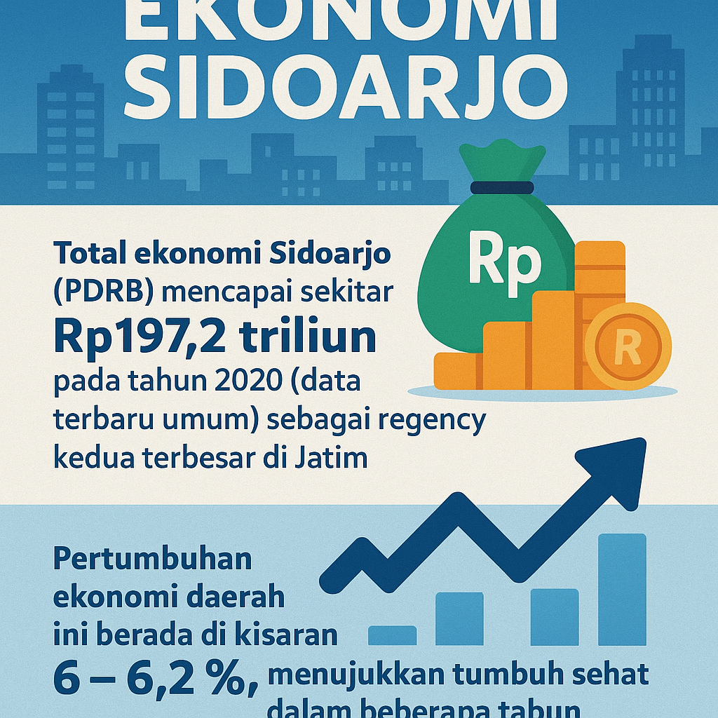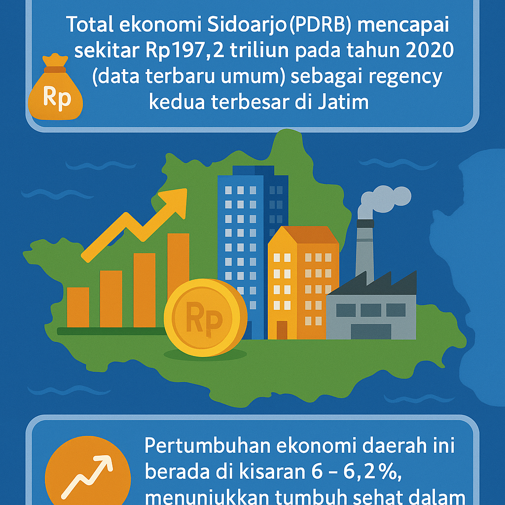Total ekonomi Sidoarjo (PDRB) mencapai sekitar Rp 197,2 triliun pada tahun 2020 (data terbaru umum) sebagai regency kedua terbesar di Jatim jurnal.ittc.web.id +8