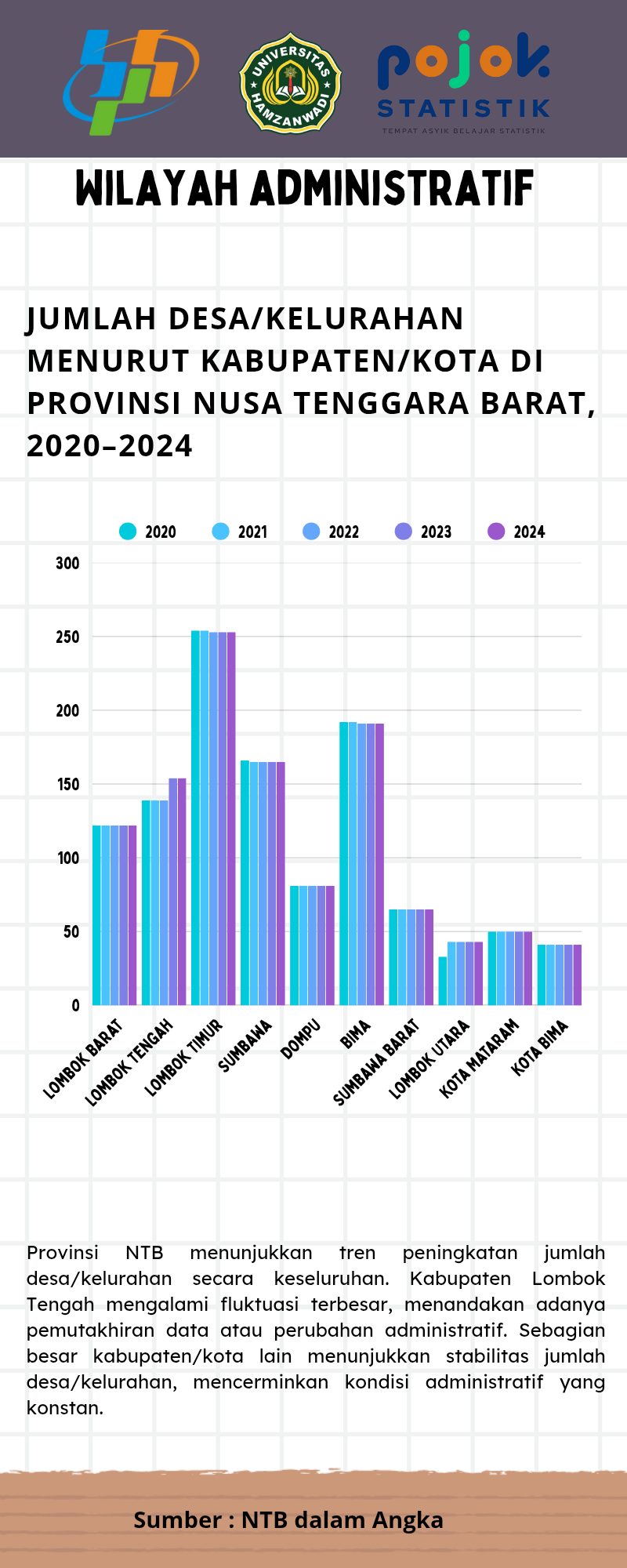 JUMLAH DESA/KELURAHAN MENURUT KABUPATEN/KOTA DI PROVINSI NUSA TENGGARA BARAT, 2020-2024