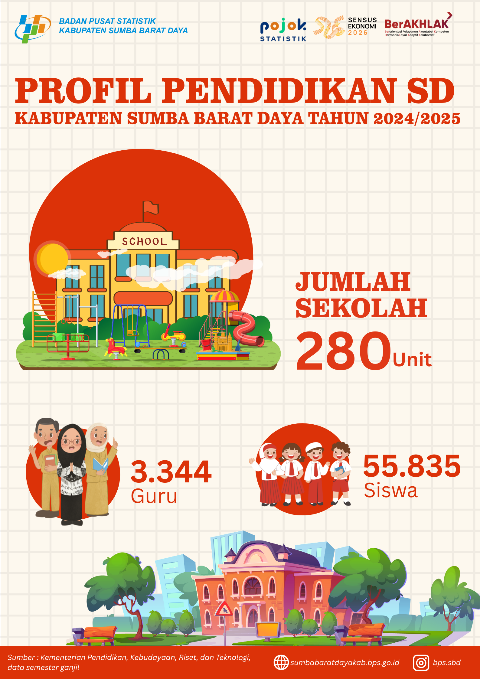 Jumlah SD sebanyak 280 unit, dengan 3.344 Guru dan 55.835 Siswa