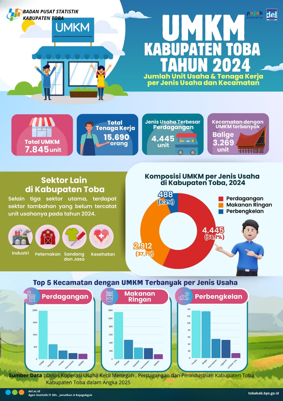 Kabupaten Toba pada tahun 2024 memiliki sebanyak 7.845 unit UMKM yang mampu menyerap 15.690 tenaga kerja. Jenis usaha terbesar berasal dari sektor perdagangan dengan jumlah...