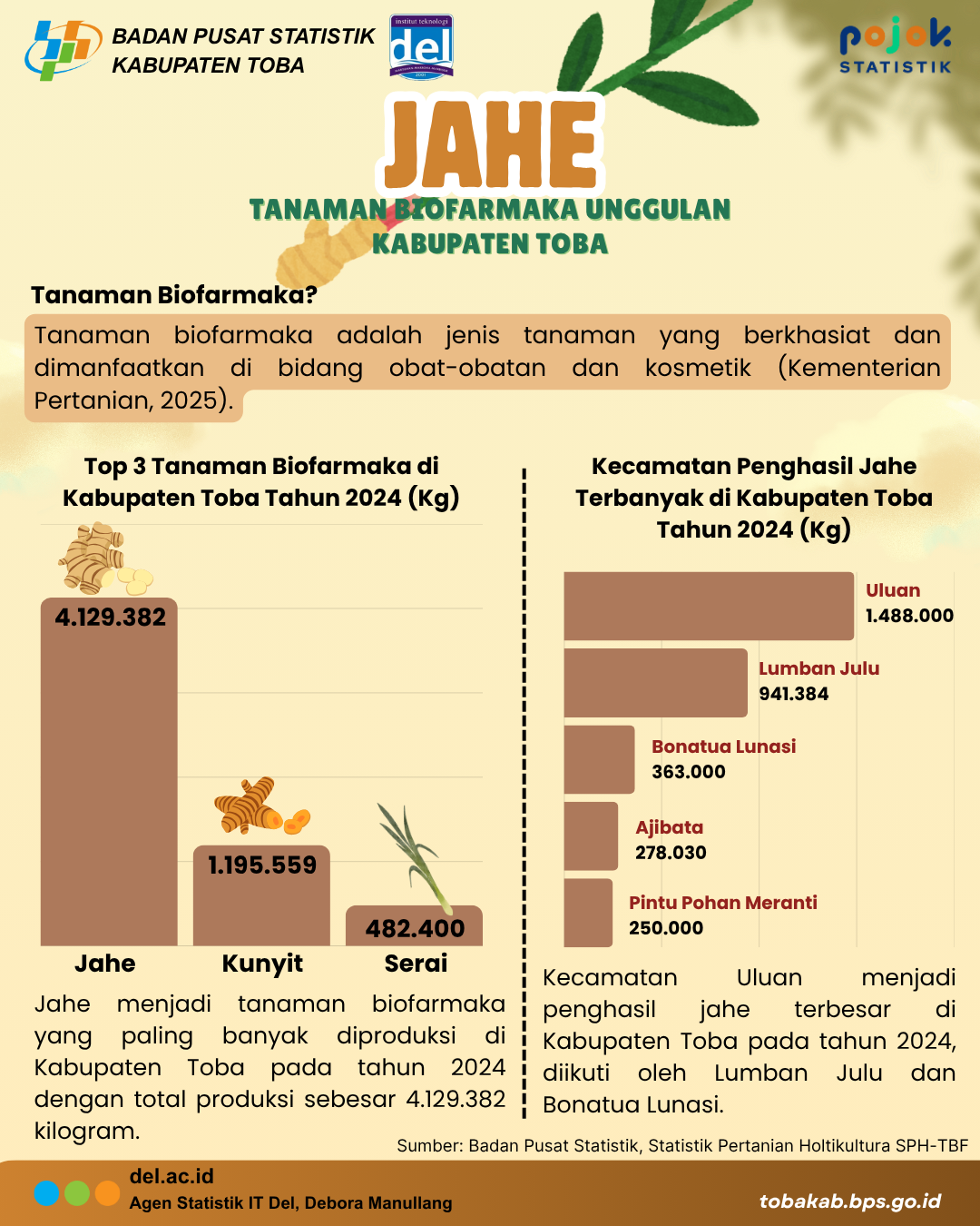 Dengan total produksi mencapai 4.129.382 kg pada tahun 2024, jahe menjadi tanaman biofarmaka dengan hasil terbanyak di Kabupaten Toba. Bersama kunyit dan serai, jahe terus...