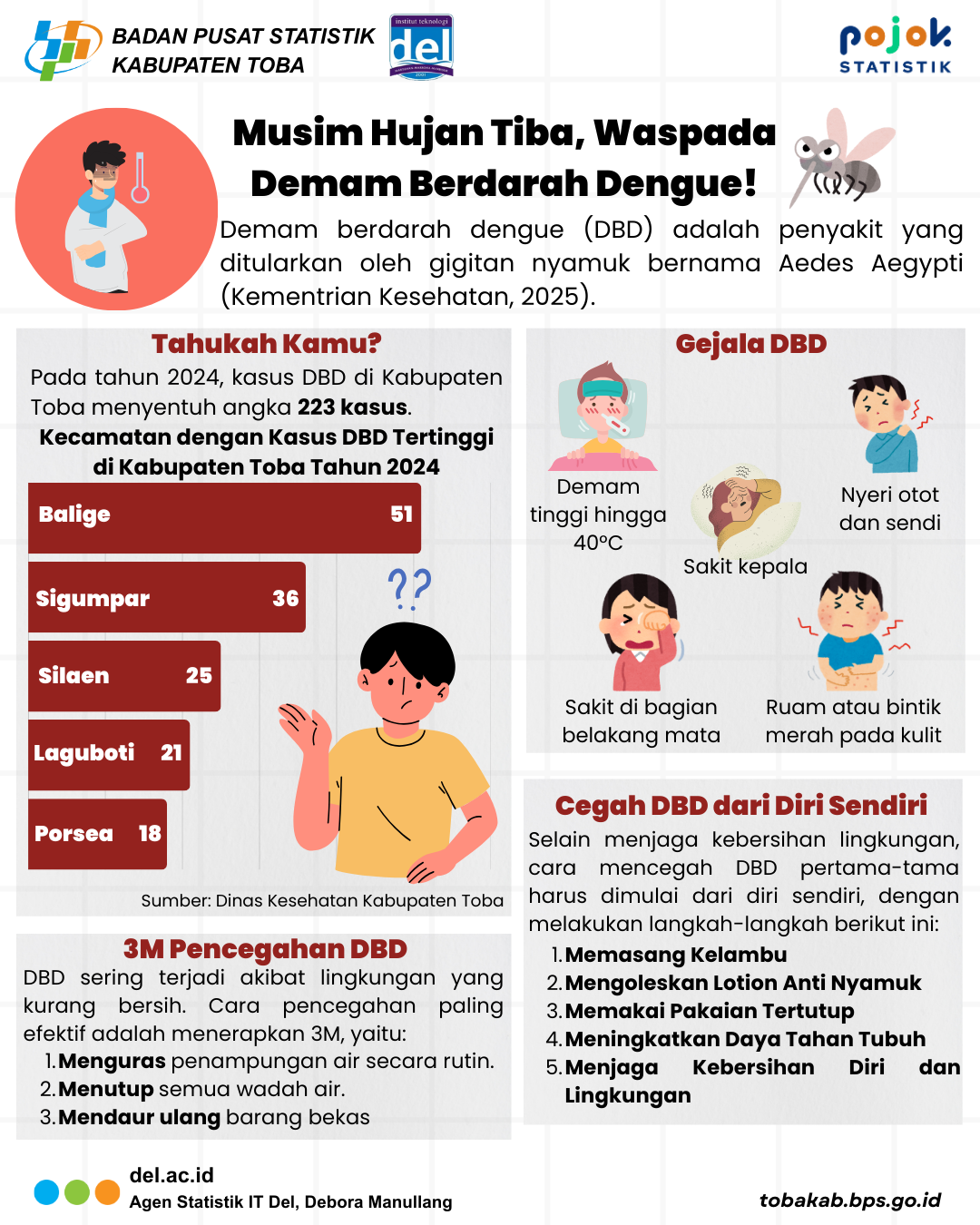 Sepanjang 2024, tercatat 223 kasus DBD di Kabupaten Toba, dengan kasus tertinggi berada di Balige. #SahabatData yuk lindungi diri dan keluarga dengan menerapkan 3M (Menguras,...