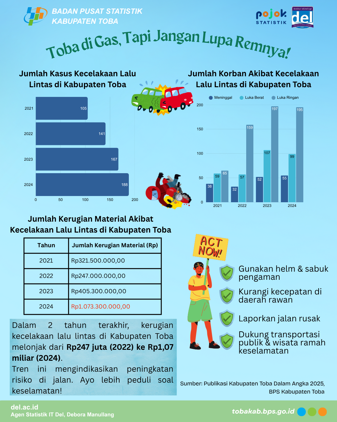 Tahukah kamu? Jumlah kecelakaan lalu lintas di Kabupaten Toba terus meningkat dalam 4 tahun terakhir. Bahkan, kerugian material akibat kecelakaan di 2024 tembus Rp1,07 miliar!...