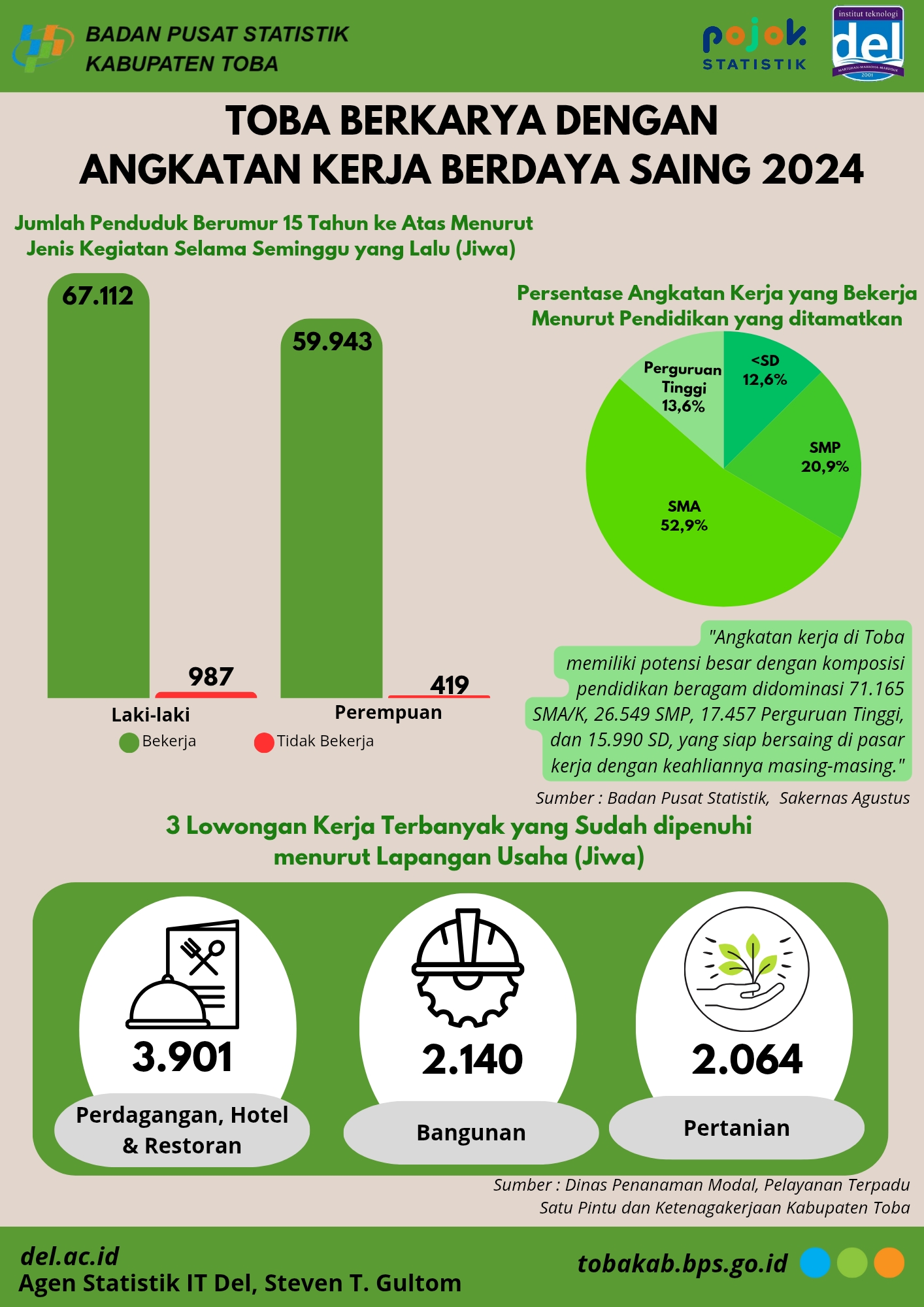 Angkatan kerja di Toba memiliki latar belakang pendidikan yang beragam, mulai dari lulusan SD hingga Perguruan Tinggi. Hal ini menunjukkan bahwa angkatan kerja di Toba...