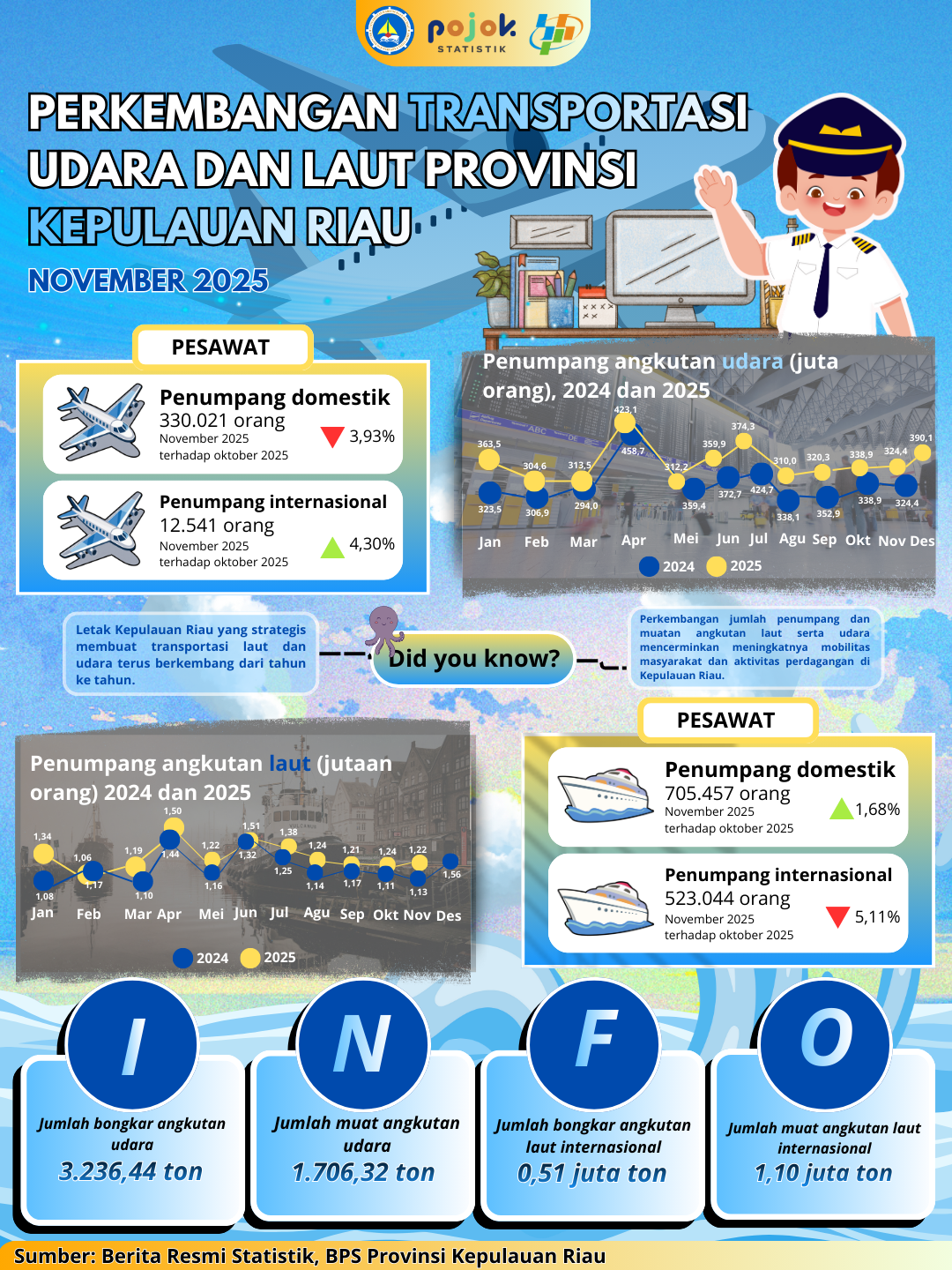 Pada November 2025, pergerakan penumpang serta aktivitas bongkar muat angkutan udara dan laut mencerminkan meningkatnya mobilitas masyarakat dan aktivitas ekonomi antarwilayah. Letak Kepulauan Riau yang...