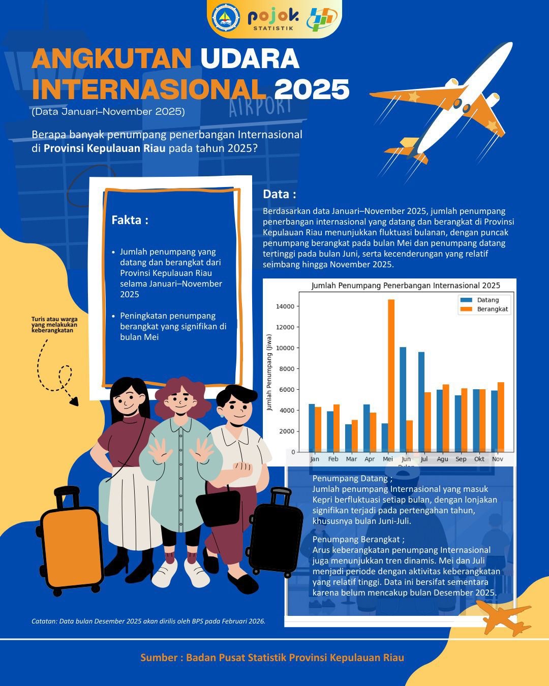Pergerakan penumpang penerbangan internasional di Provinsi Kepulauan Riau berfluktuasi sepanjang Januari–November 2025, dengan lonjakan aktivitas pada pertengahan tahun.