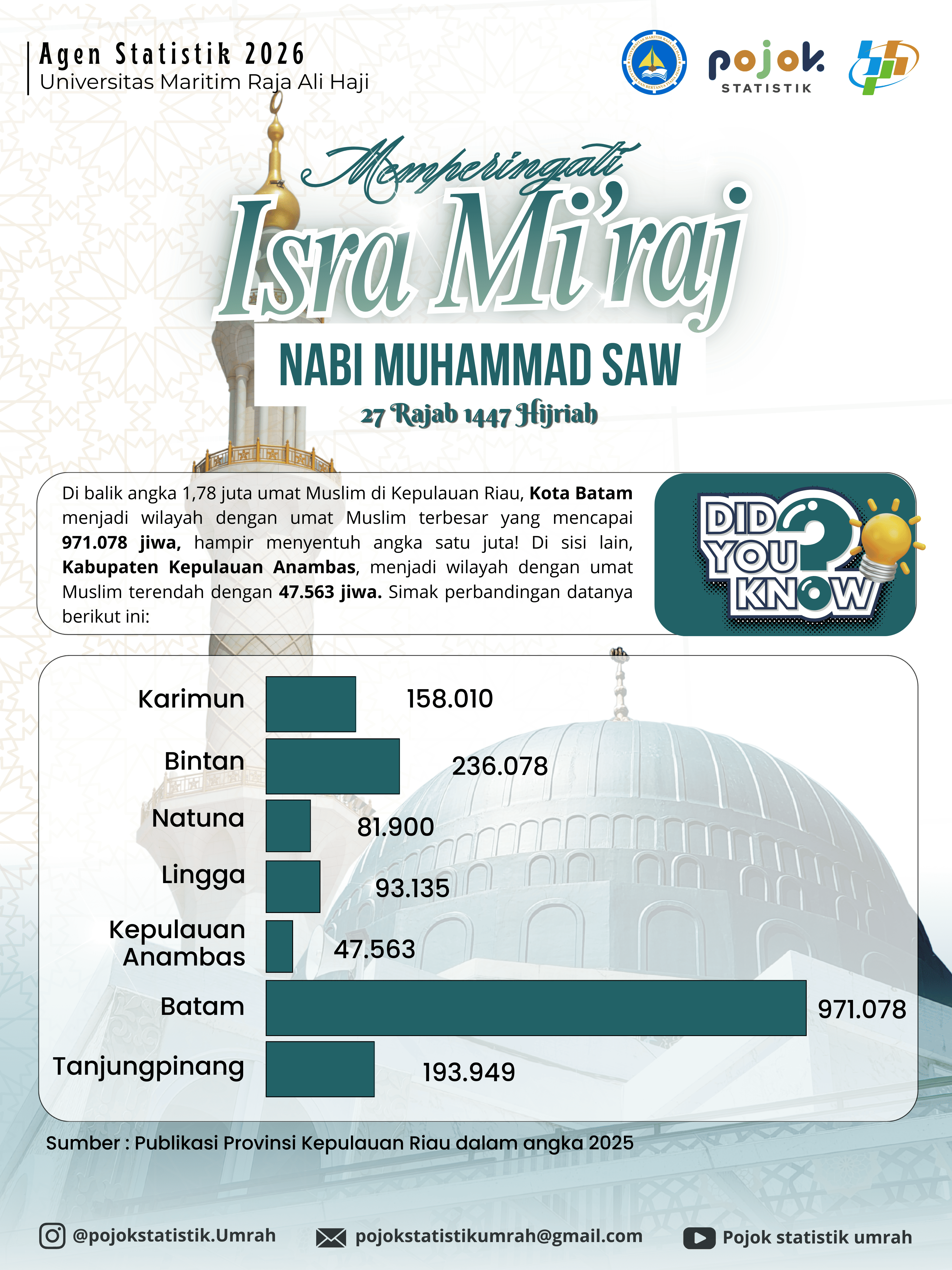 Di balik angka 1,78 juta umat Muslim di Provinsi Kepulauan Riau, Kota Batam menjadi wilayah dengan jumlah Muslim terbanyak (971.078 jiwa), sementara Kabupaten Kepulauan Anambas...
