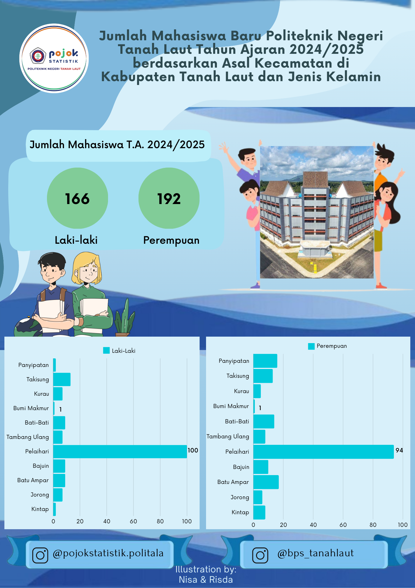 Jumlah Mahasiswa Baru Politeknik Negeri Tanah Laut Tahun Ajaran 2024/2025 berdasarkan Asal Kecamatan di Kabupaten Tanah Laut dan Jenis Kelamin