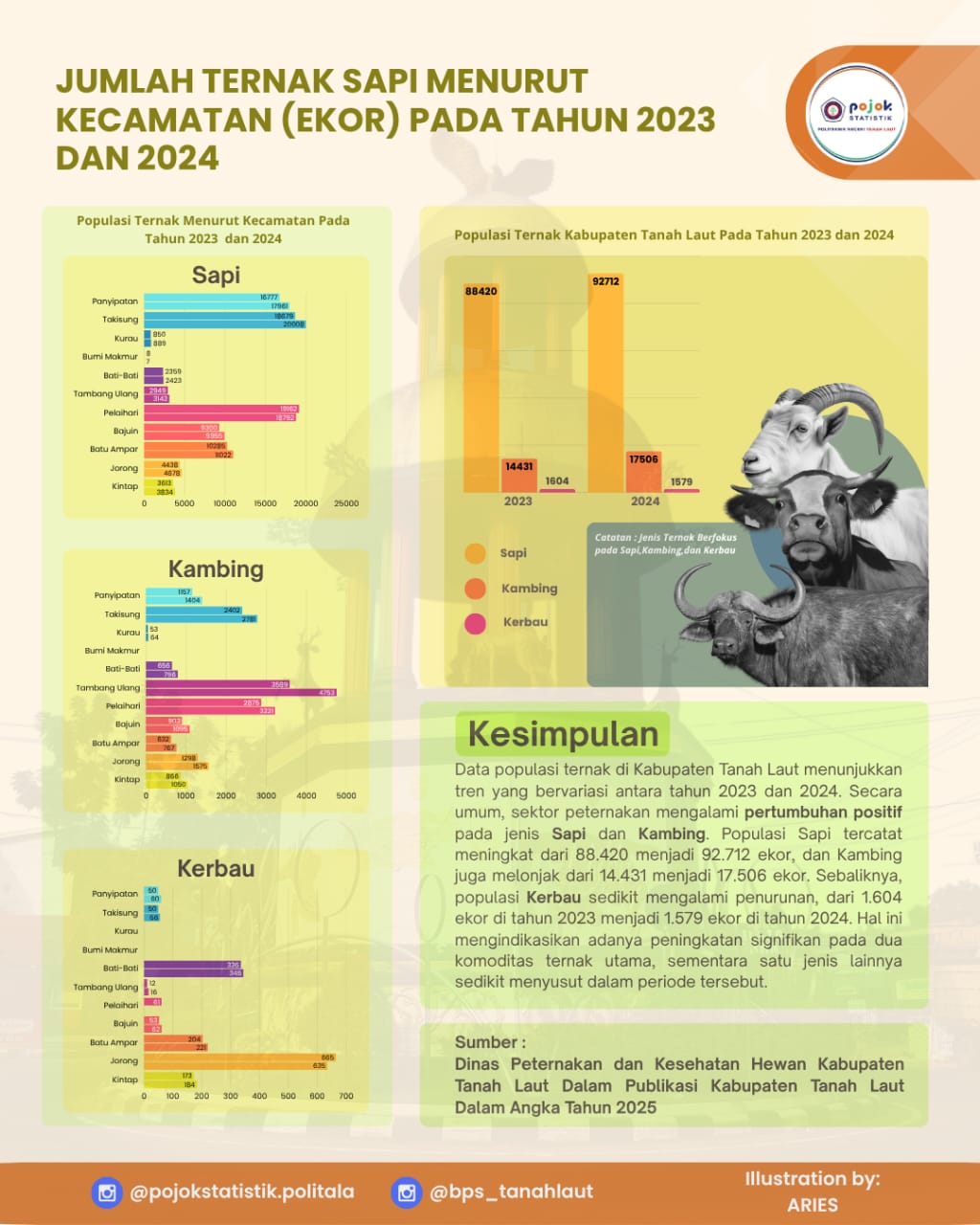 Jumlah Ternak Sapi Menurut Kecamatan (Ekor) Pada Tahun 2023 dan 2024