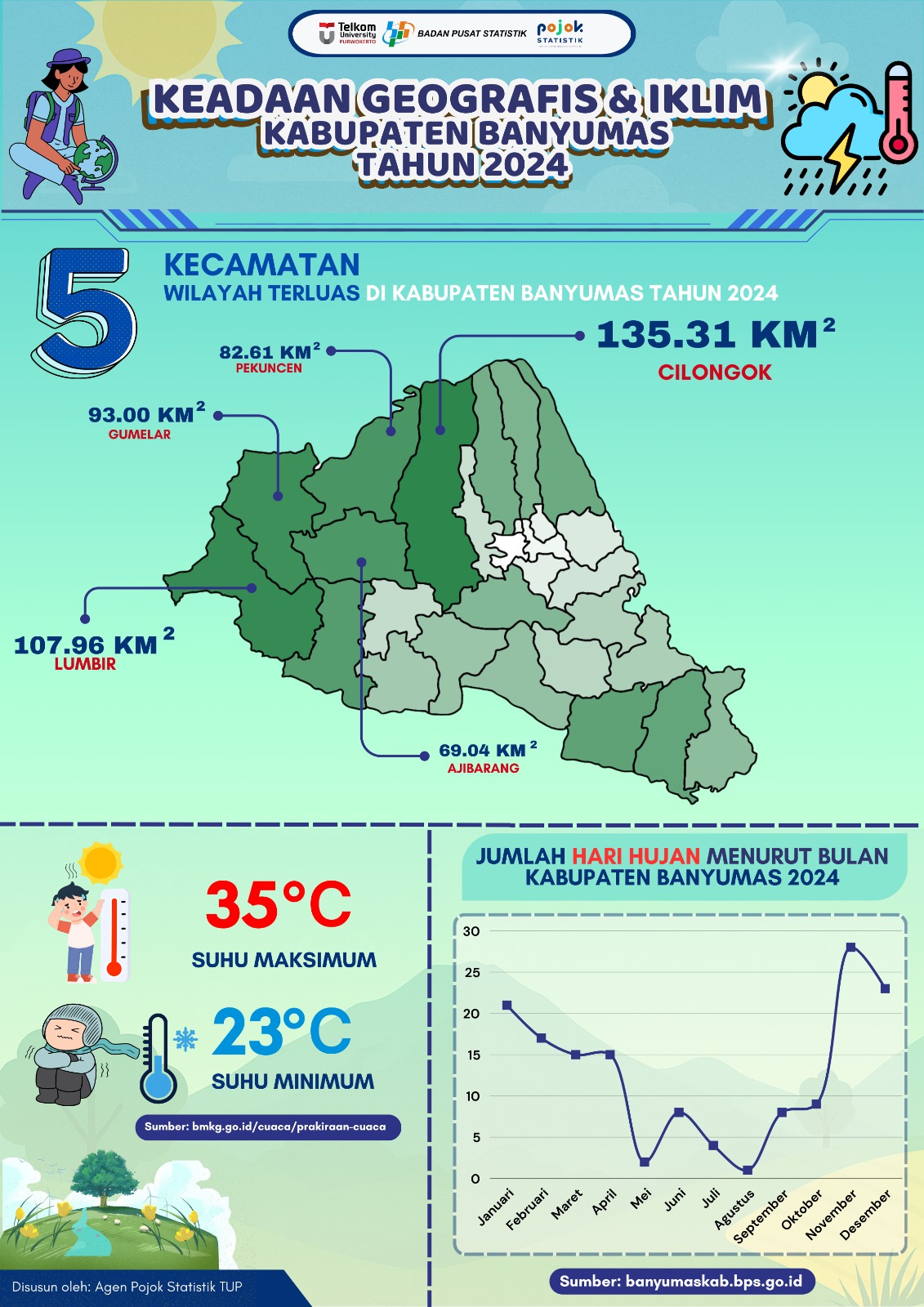 Infografis ini menggambarkan kondisi geografis dan iklim Kabupaten Banyumas tahun 2024, di mana Kecamatan Cilongok tercatat sebagai wilayah terluas (135,31 km²), diikuti Lumbir, Gumelar, Pekuncen,...