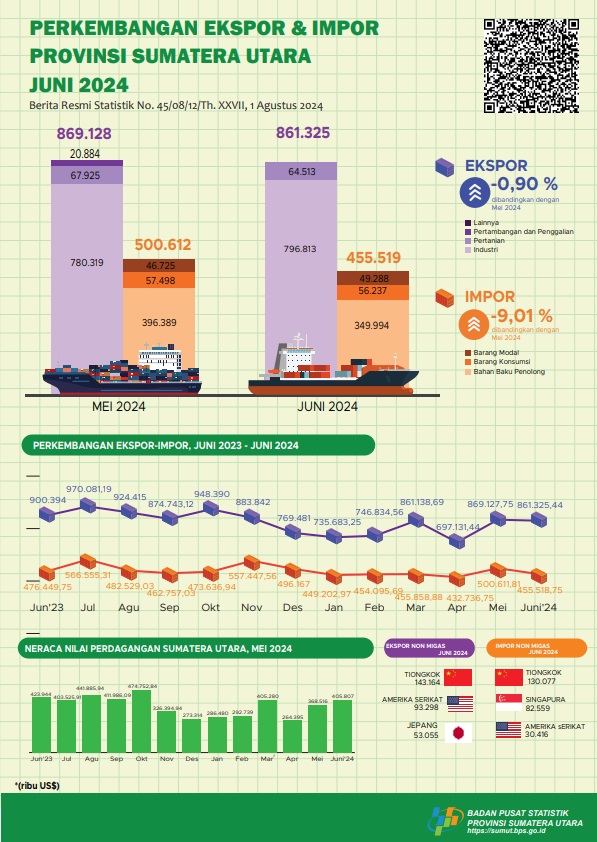 Perkembangan Ekspor & Impor Provinsi Sumatera Utara Juni 2024