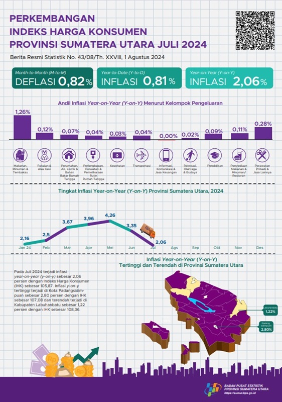 Pada Juli 2024 terjadi inflasi year-on-year (y-on-y) Provinsi Sumatera Utara sebesar 2,06 persen dengan Indeks Harga Konsumen (IHK) sebesar 105,87. Inflasi tertinggi terjadi di Kota...