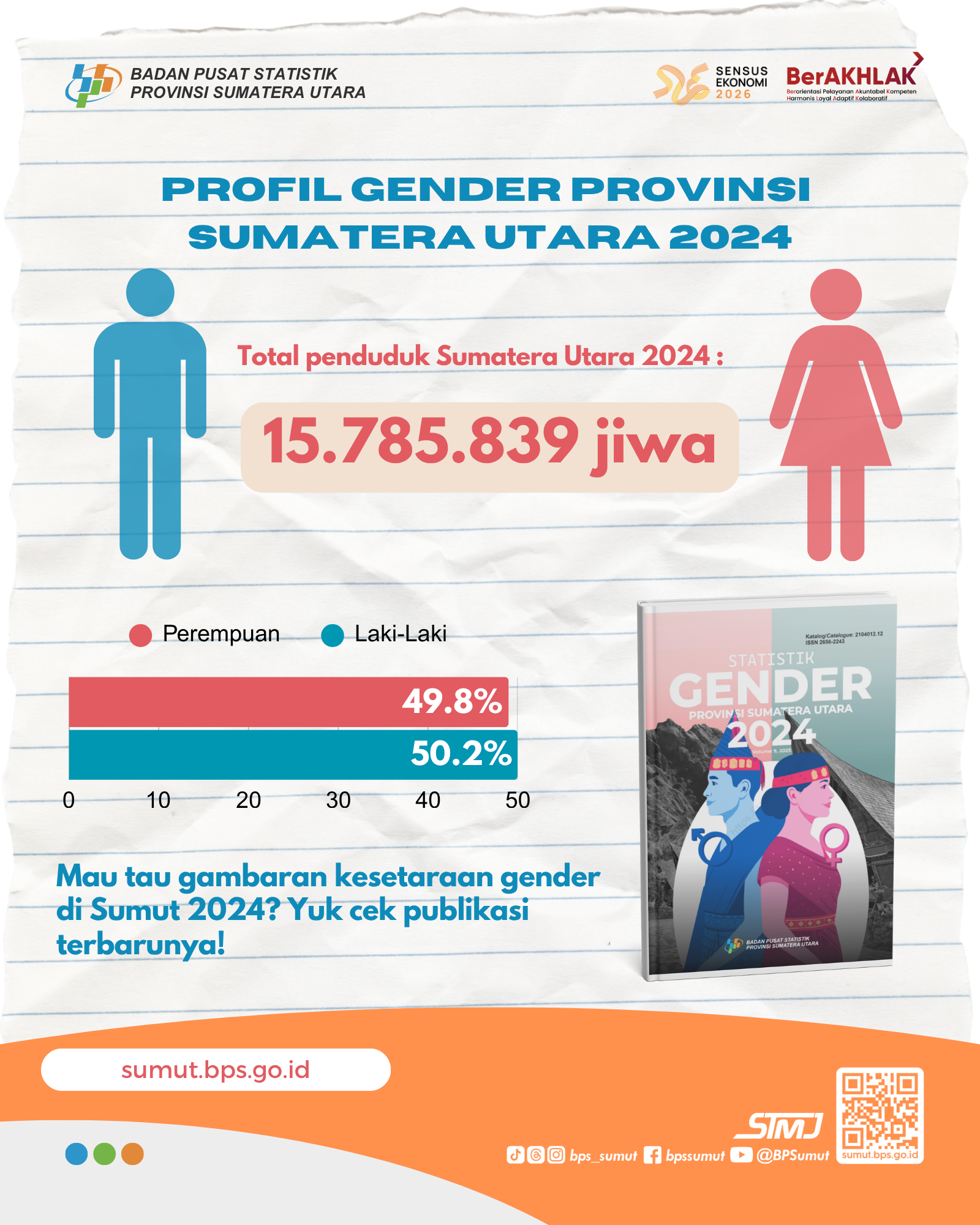 Total penduduk Sumatera Utara 2024 15.785.839 Jiwa dengan Proporsi 49.8% Perempuan dan 50.2% Laki-laki. Bagaimana gambaran kesetaraan gender di Sumatera Utara 2024, Unduh Publikasinya di...
