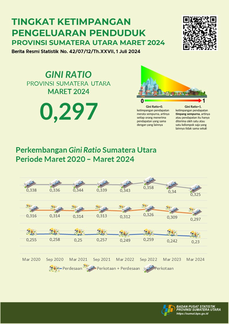 Pada Maret 2024, (tingkat ketimpangan pengeluaran penduduk yang diukur dengan) Gini Ratio Sumatera Utara tercatat sebesar 0,297. Angka ini menurun sebesar 0,012 poin jika dibandingkan...