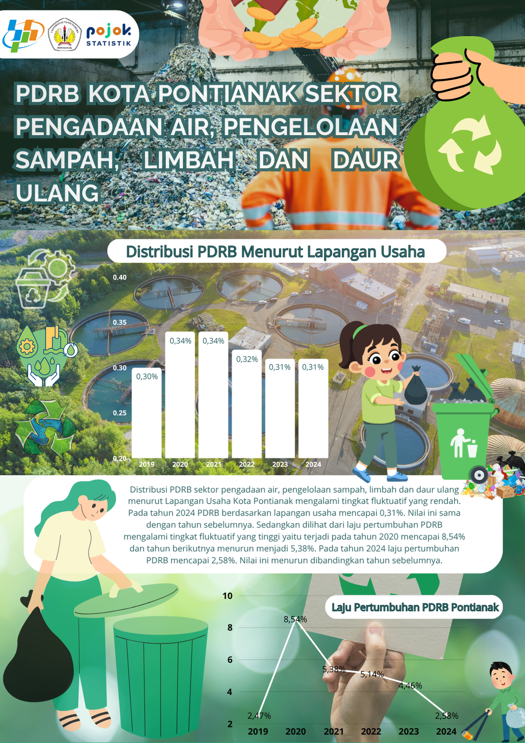 Infografis ini bertujuan untuk menyampaikan informasi mengenai keadaan PDRB kota Pontianak pada sektor pengadaan air, pengelolaan sampah, limbah dan daur ulang