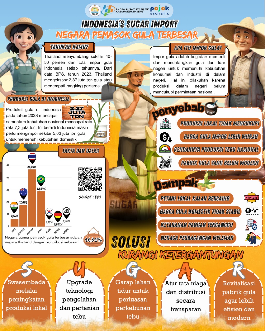 Infografis ini menyoroti ketergantungan Indonesia pada impor gula, terutama dari Thailand yang menyumbang 46,84% impor tahun 2023. Produksi domestik hanya 3,27 juta ton dari kebutuhan...