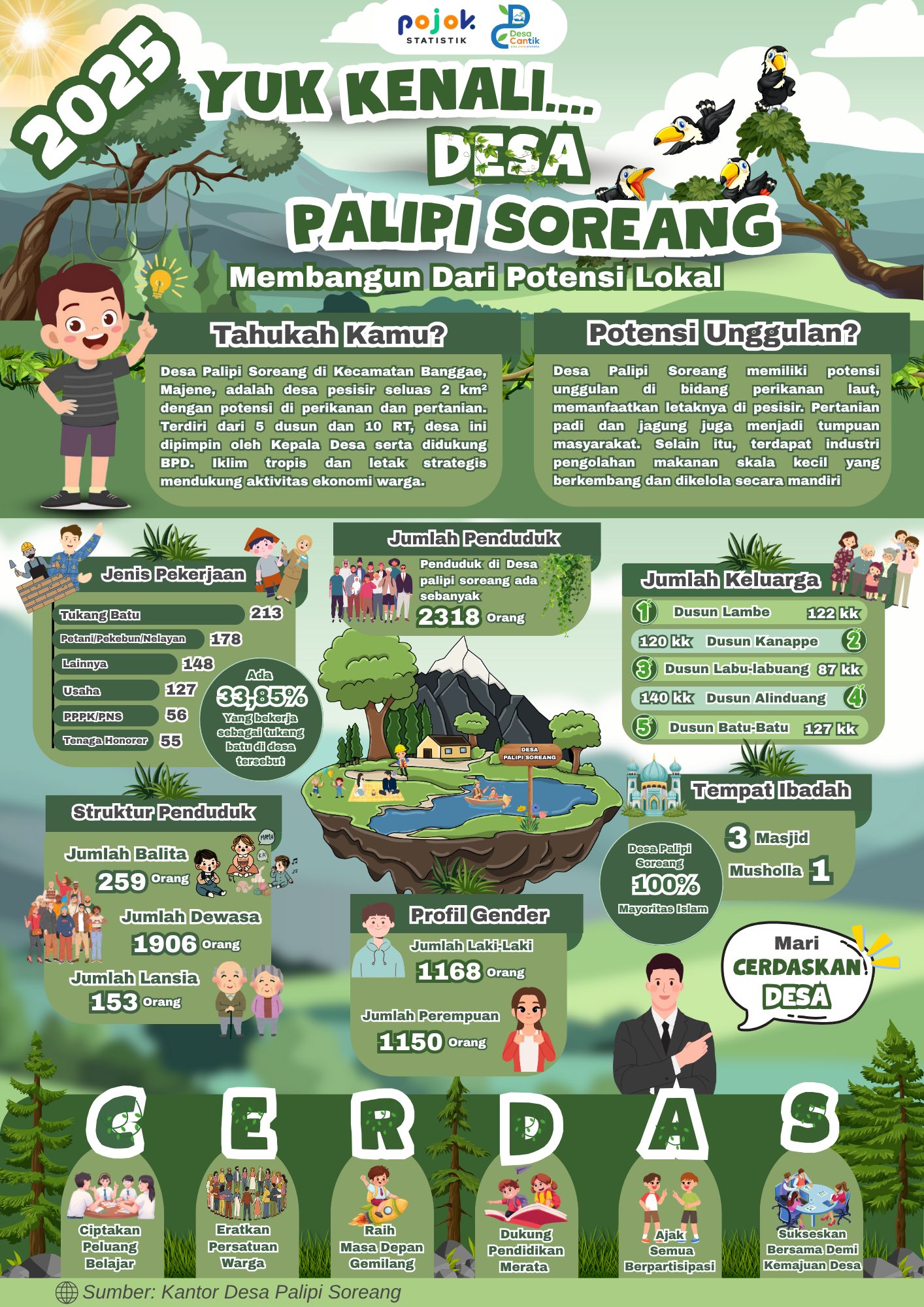 Infografis ini menampilkan profil Desa Palipi Soreang, desa pesisir di Majene dengan potensi unggulan perikanan laut, pertanian, dan usaha kecil. Berpenduduk 2.318 jiwa, desa ini...