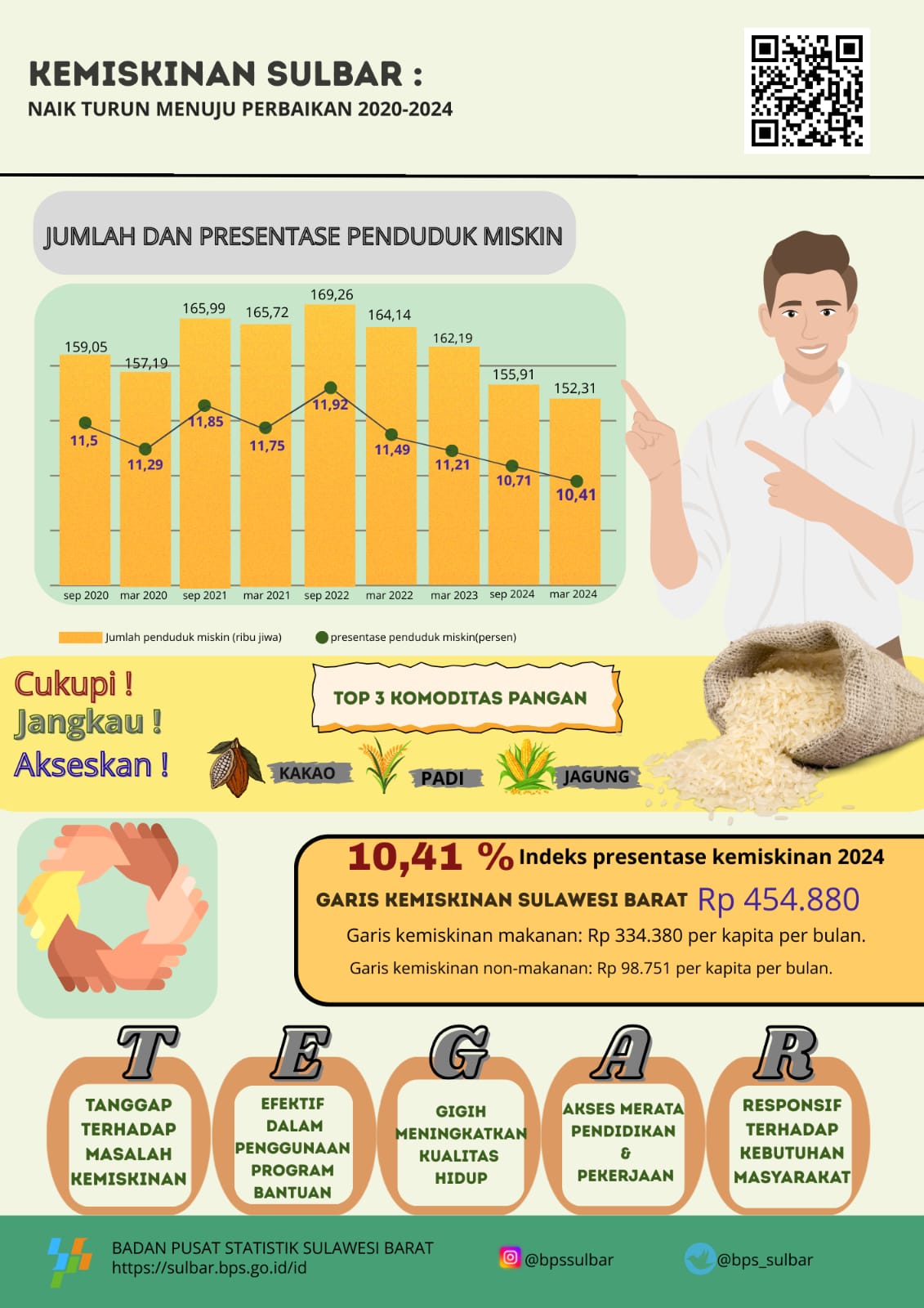 Kemiskinan di Sulawesi Barat mengalami fluktuasi 2020–2024, tertinggi pada Maret 2022 sebesar 11,92% (169,26 ribu jiwa) dan turun menjadi 10,41% (152,31 ribu jiwa) pada Maret...