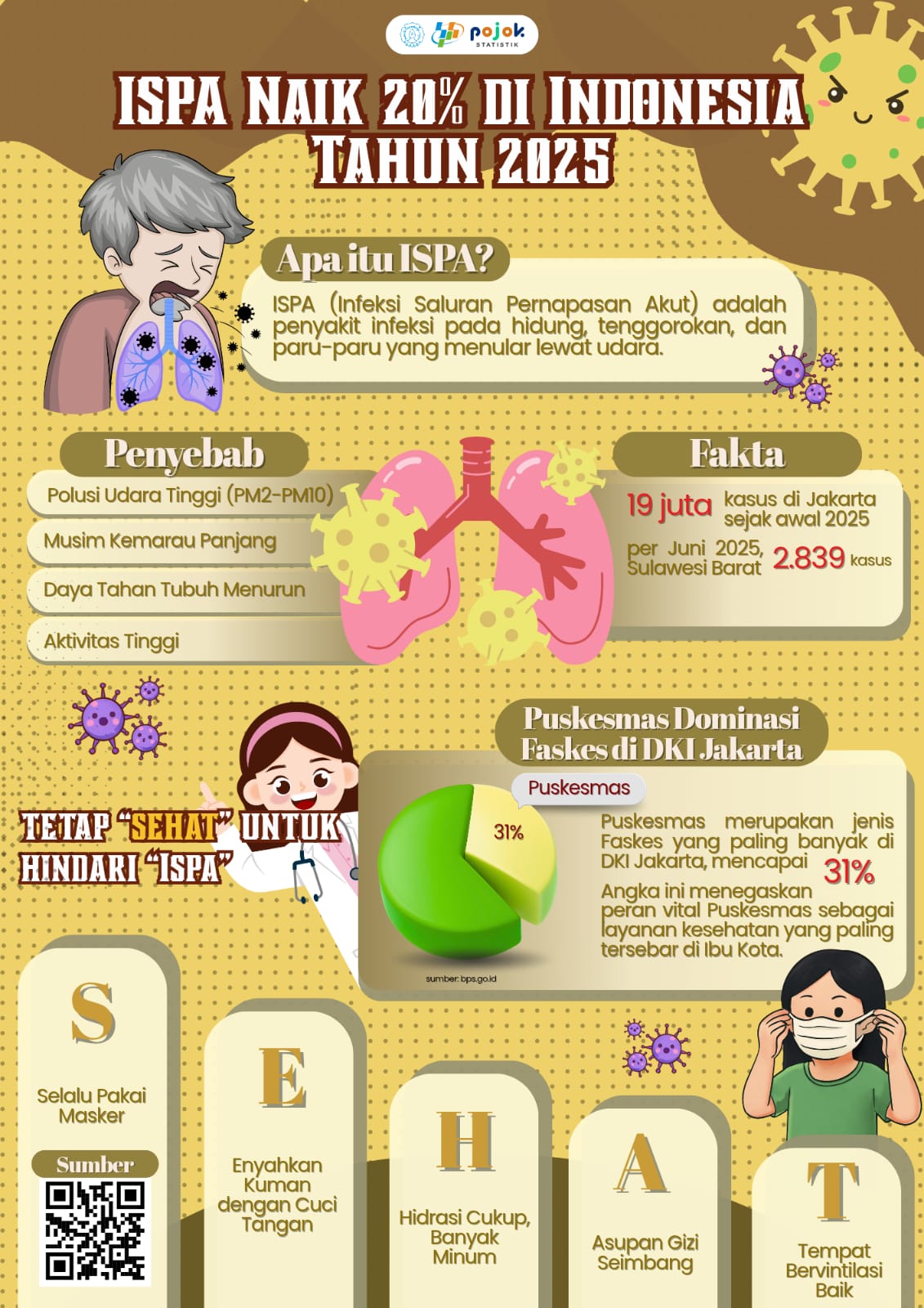 Infografis ini menginformasikan kenaikan 20% kasus ISPA (Infeksi Saluran Pernapasan Akut) di Indonesia pada tahun 2025. ISPA adalah infeksi saluran pernapasan yang menular lewat udara,...