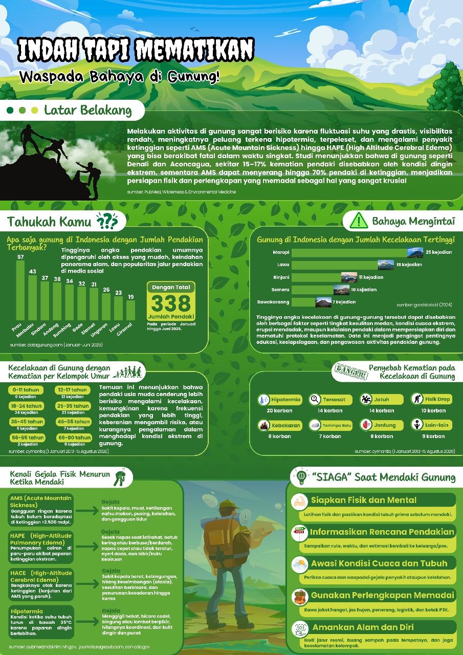 Melakukan aktivitas di gunung sangat berisiko karena fluktuasi suhu yang drastis, visibilitas rendah, meningkatnya peluang terkena hipotermia, terpeleset, dan mengalami penyakit ketinggian seperti AMS (Acute...