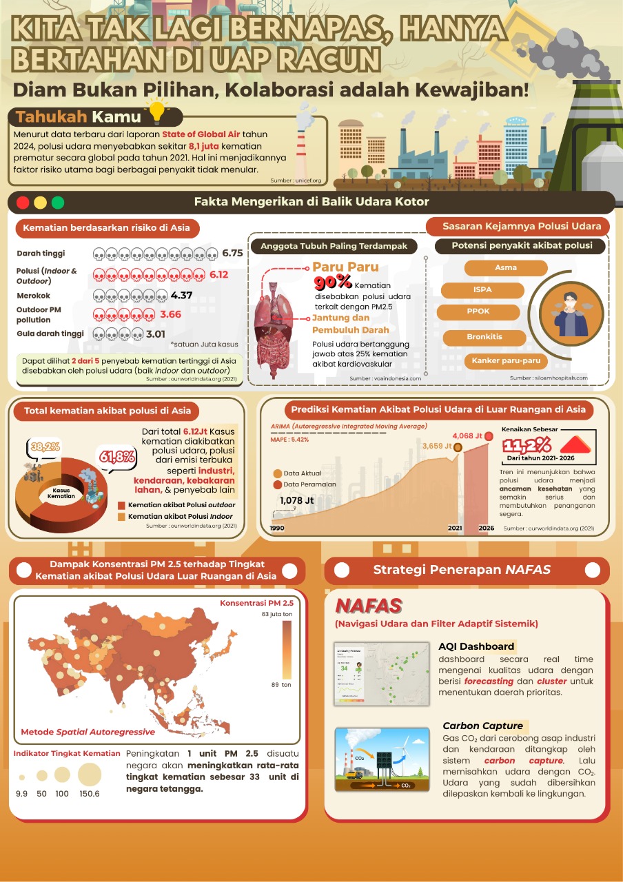 Infografis ini membahas mengenai ancaman polusi udara yang menjadi salah satu penyebab kematian tertinggi di Asia serta berpotensi menyebabkan penyakit asma, ISPA, PPOK, bronkitis, dan...