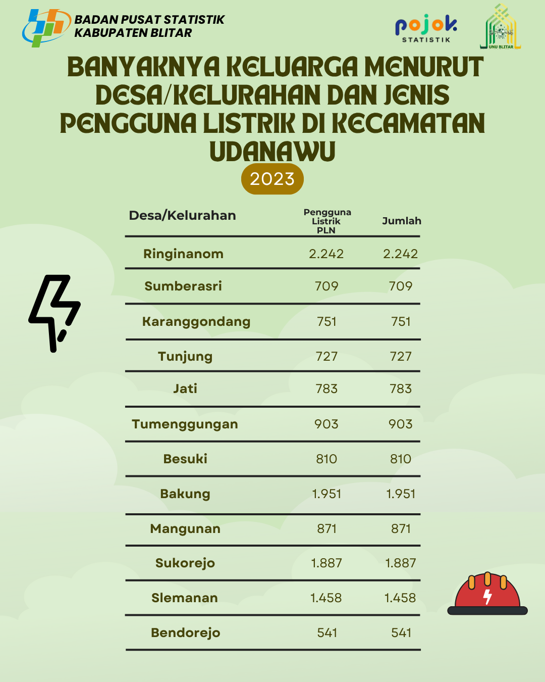 Banyaknya Keluarga Menurut Desa/Kelurahan dan Jenis Pengguna Listrik di Kecamatan Udanawu 2023