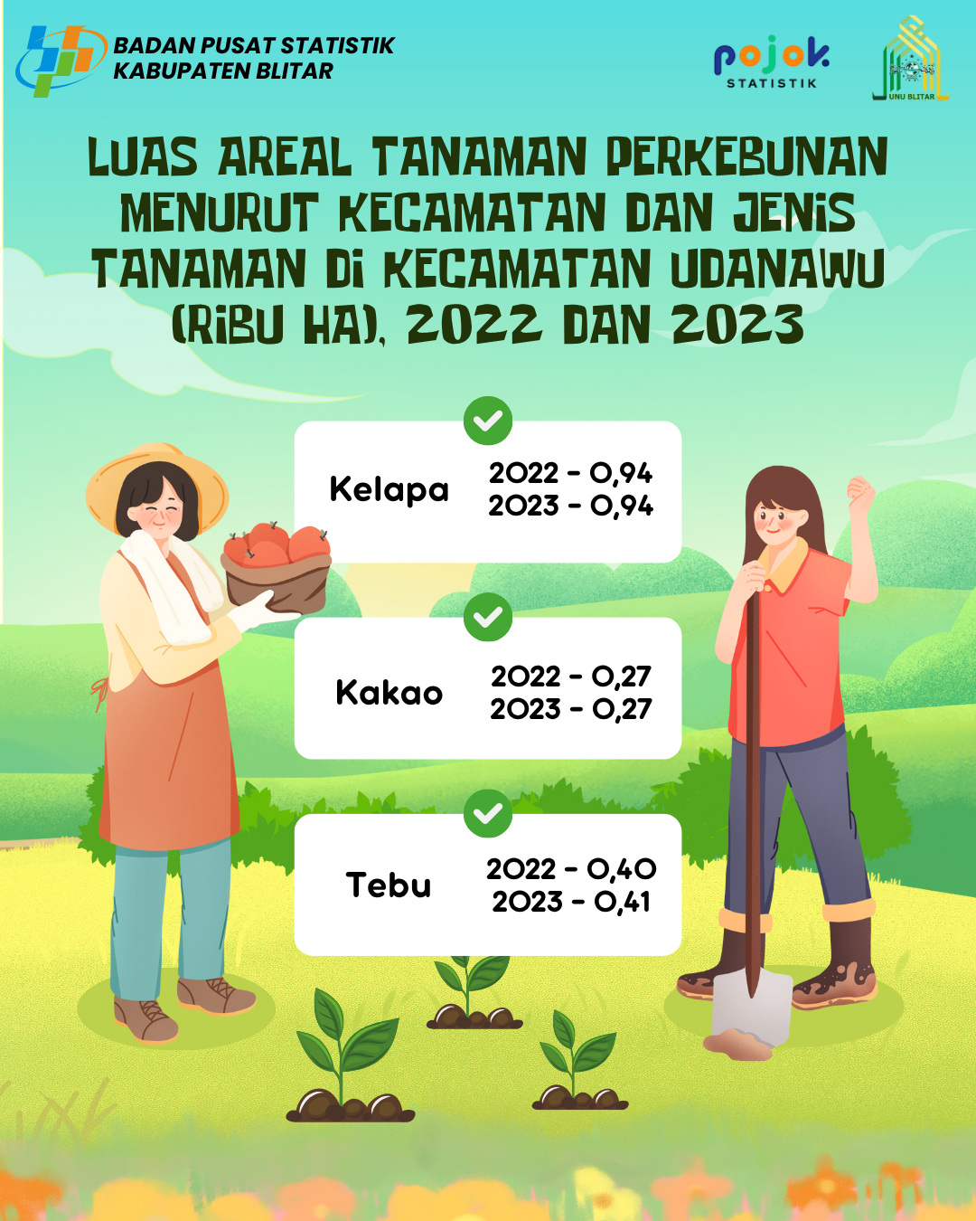 Luas Areal Tanaman Perkebunan Menurut Kecamatan dan Jenis Tanaman di Kecamatan Udanawu (ribu ha) 2022 dan 2023