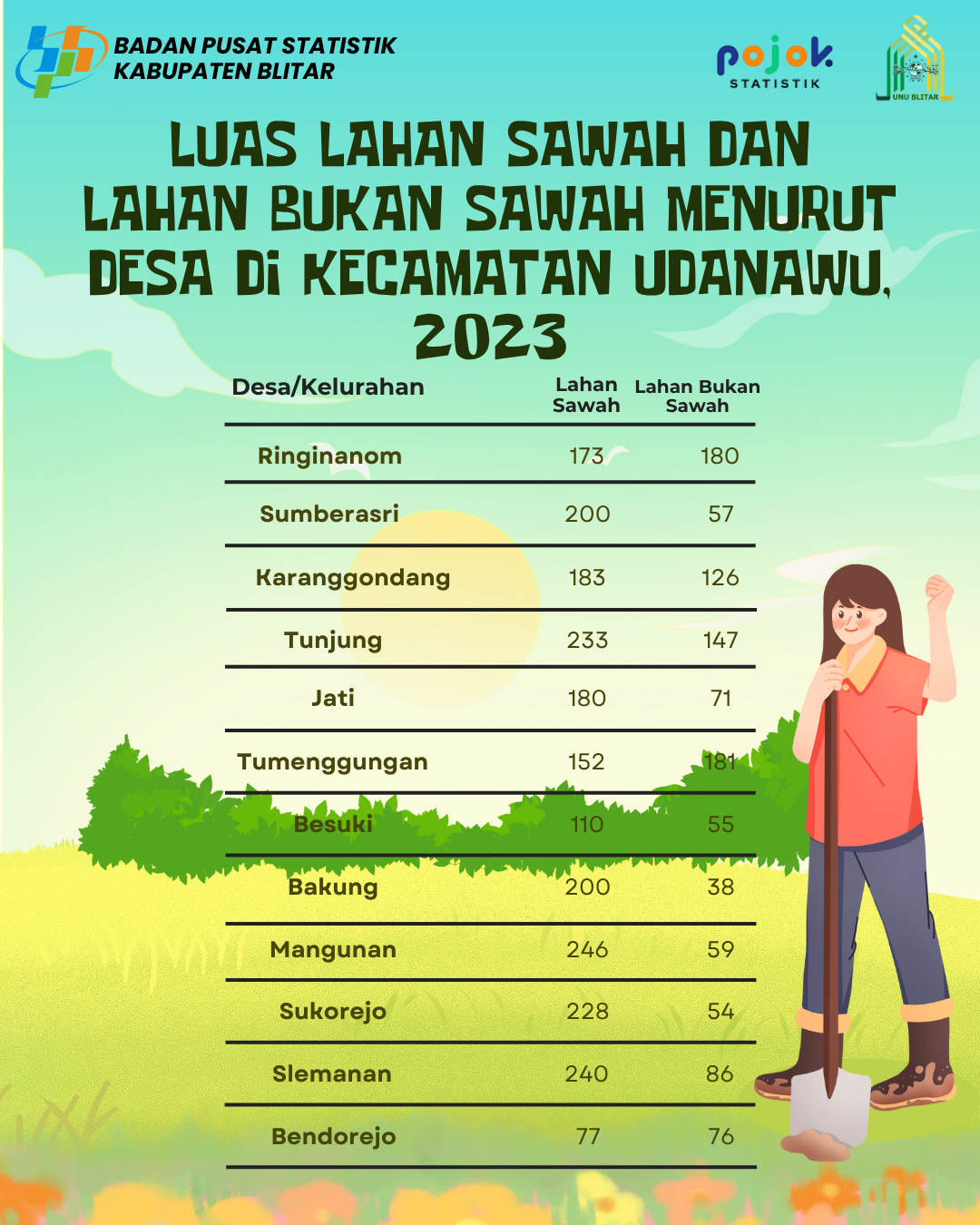 Luas Lahan Sawah dan Lahan Bukan Sawah Menurut Desa di Kecamatan Udanawu 2023