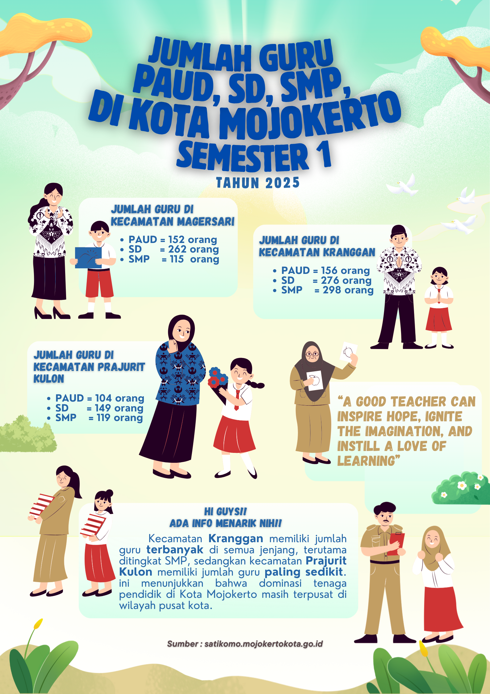 banyaknya guru PAUD,SD, SMP di Kota Mojokerto per kecamatan pada semester 1 2025