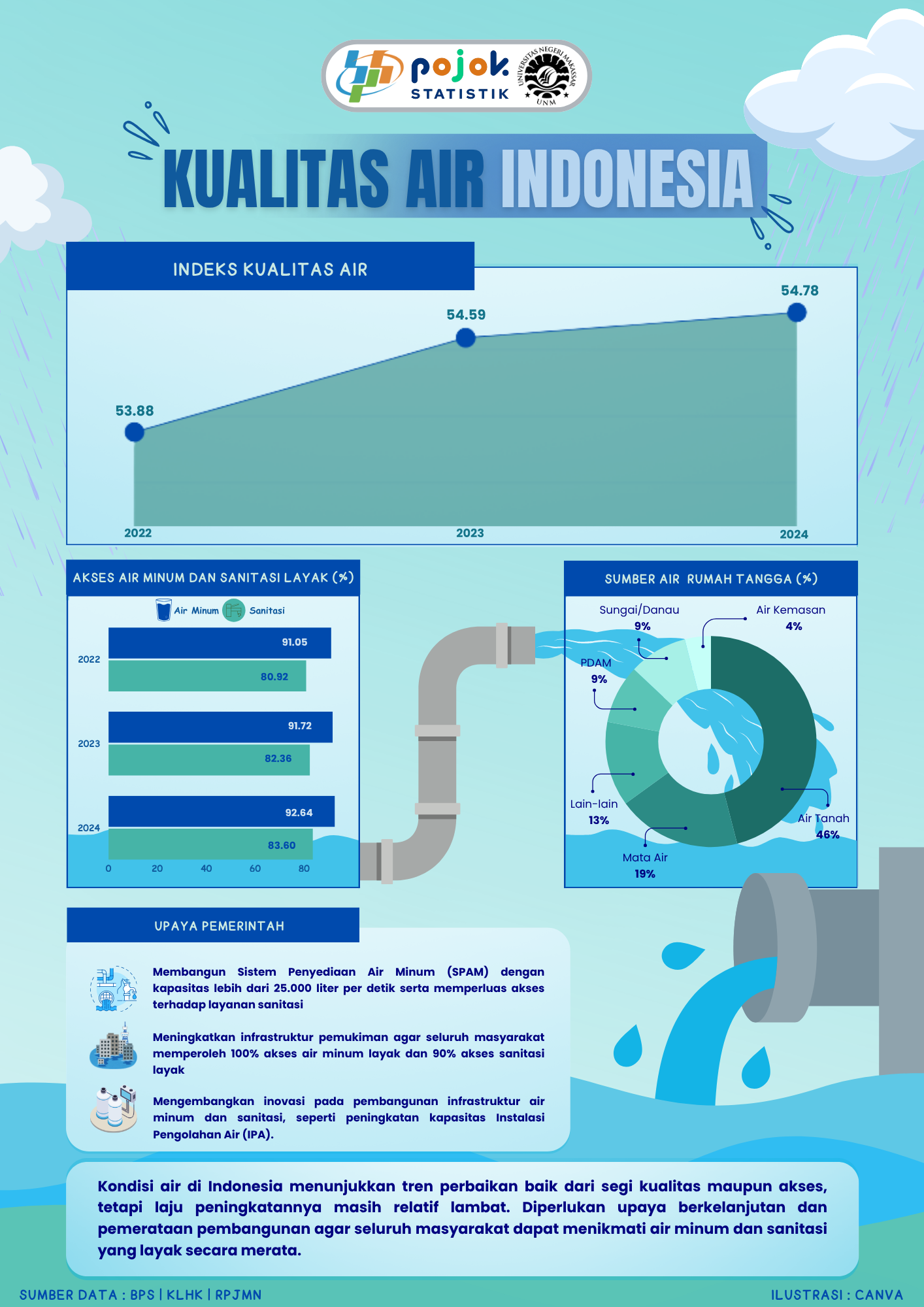 Kondisi air di Indonesia menunjukkan tren perbaikan baik dari segi kualitas maupun akses, tetapi laju peningkatannya masih relatif lambat. Diperlukan upaya berkelanjutan dan pemerataan pembangunan...
