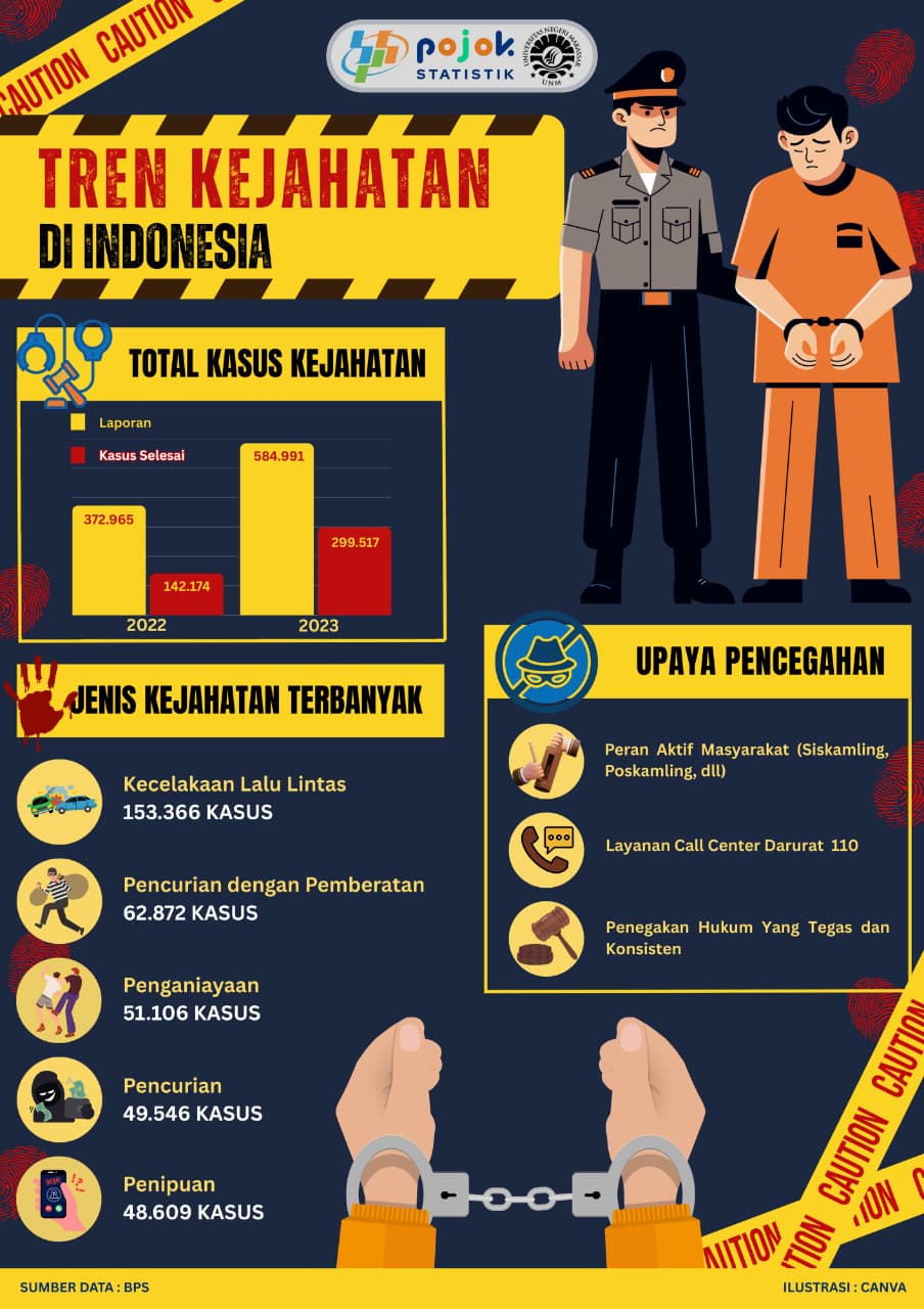 Kasus kejahatan di Indonesia meningkat dari 372.965 kasus pada 2022 menjadi 584.991 kasus pada 2023, namun penyelesaian kasus juga bertambah dari 142.174 menjadi 299.517. Jenis...