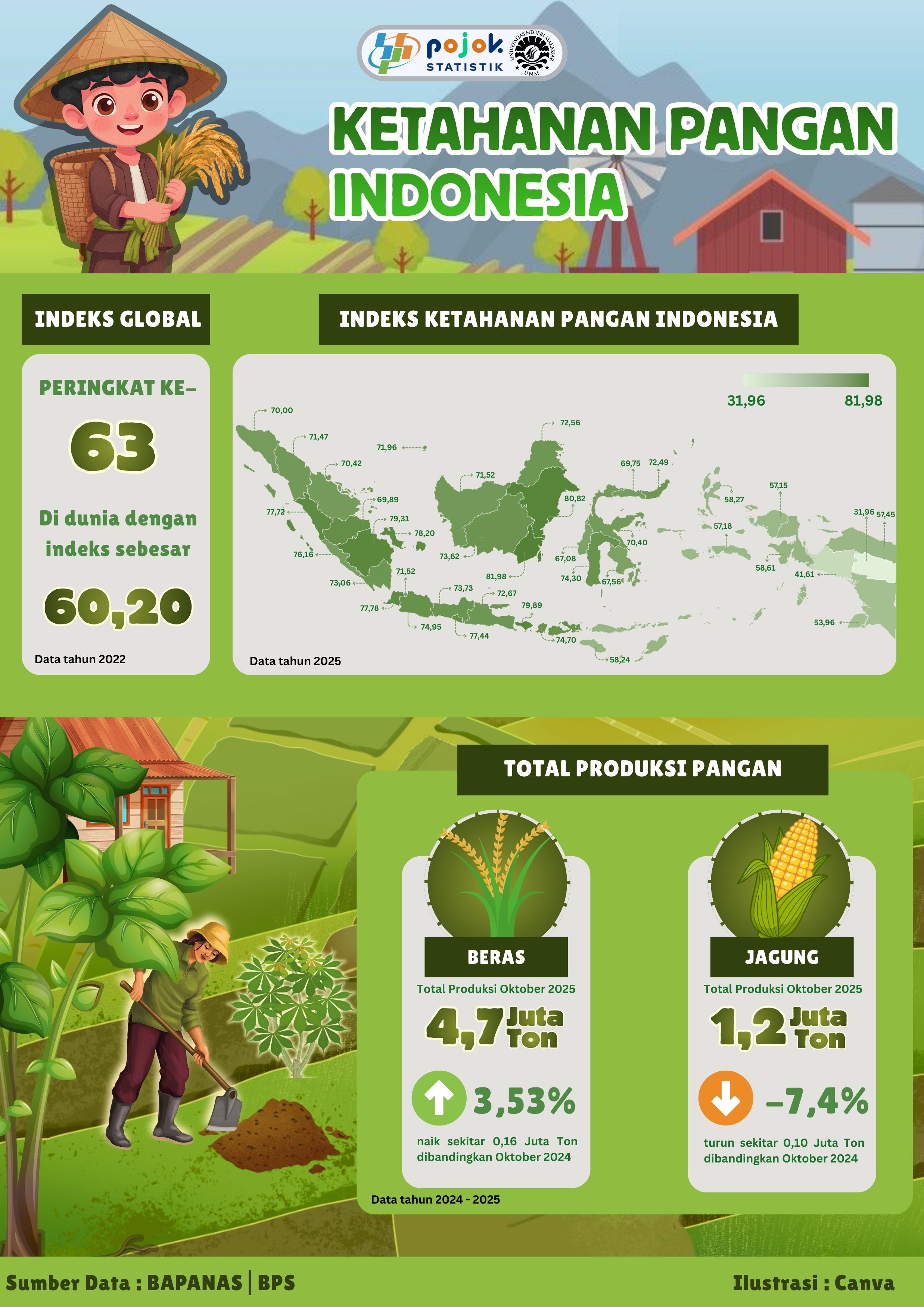 Secara global, Indonesia menempati peringkat ke-63 dunia dengan skor indeks 60,20 (tahun 2022). Pada tingkat nasional, ditampilkan Indeks Ketahanan Pangan Indonesia tahun 2025 yang menunjukkan...