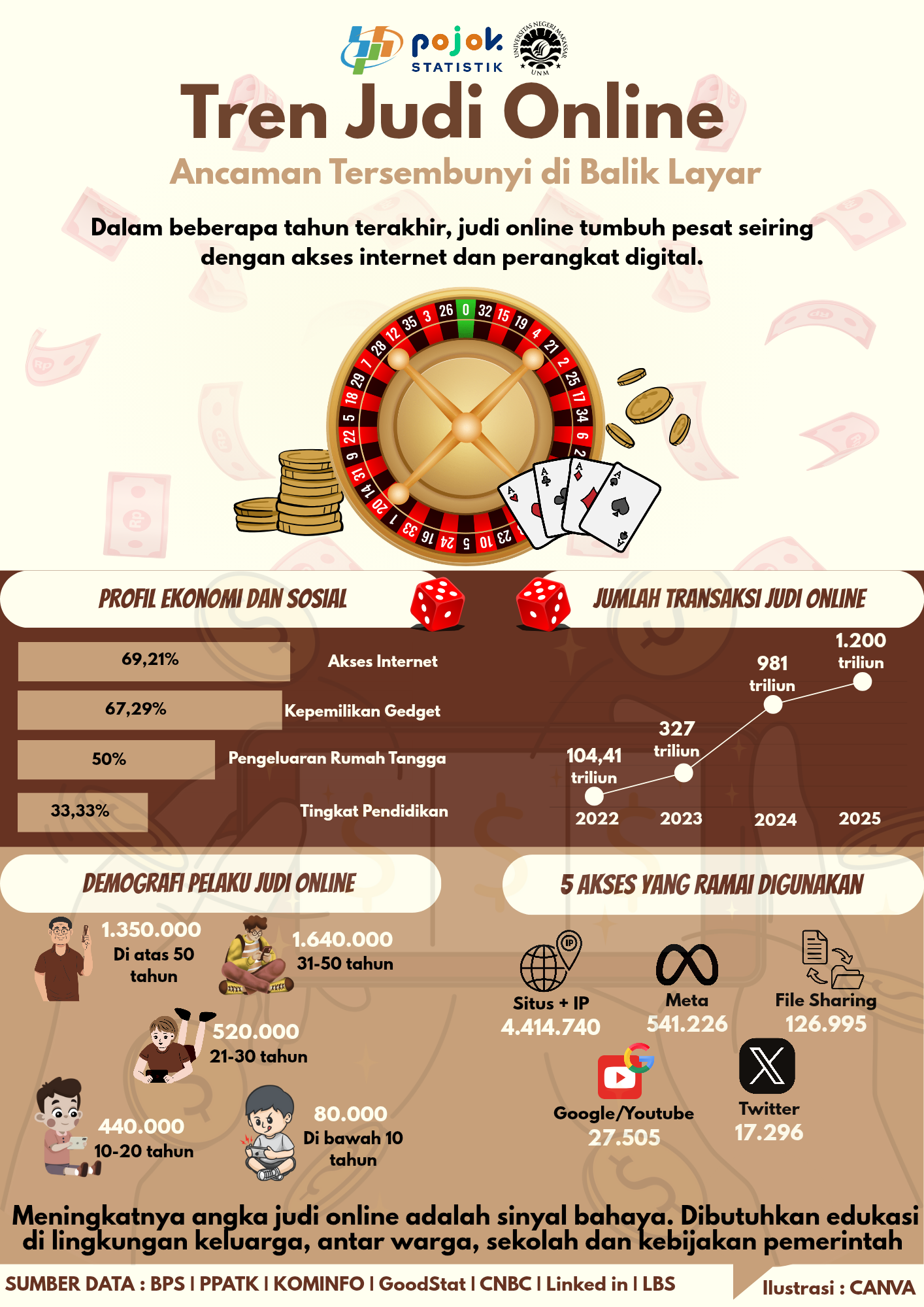 Dalam beberapa tahun terakhir, judi online tumbuh pesat seiring dengan akses internet dan perangkat digital. Pada tahun 2025 jumlah transaksi online mencapai 1.200 triliun. Meningkatnya...