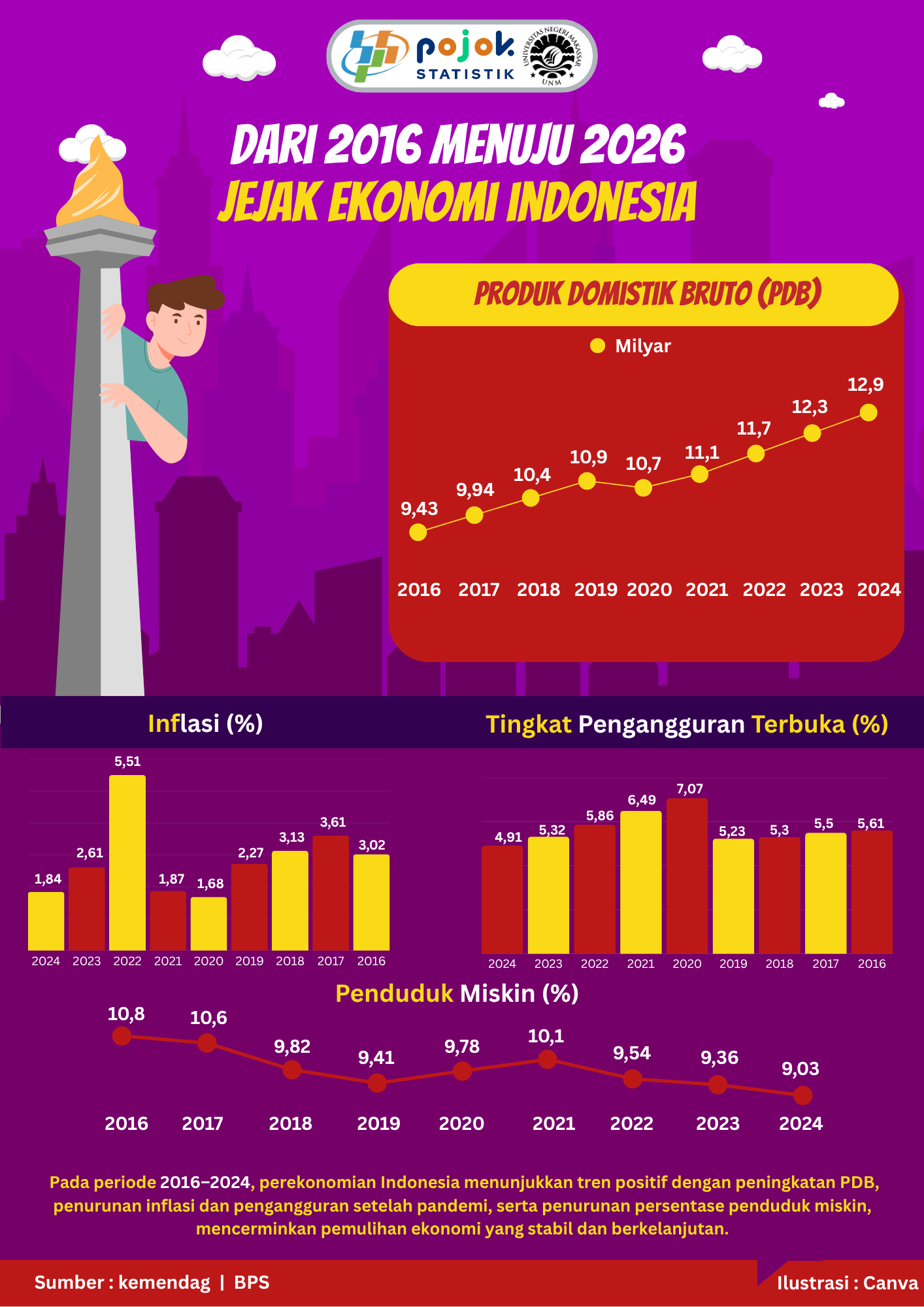 Pada periode 2016–2024, perekonomian Indonesia menunjukkan tren positif dengan peningkatan PDB, penurunan inflasi dan pengangguran setelah pandemi, serta penurunan persentase penduduk miskin, mencerminkan pemulihan ekonomi...