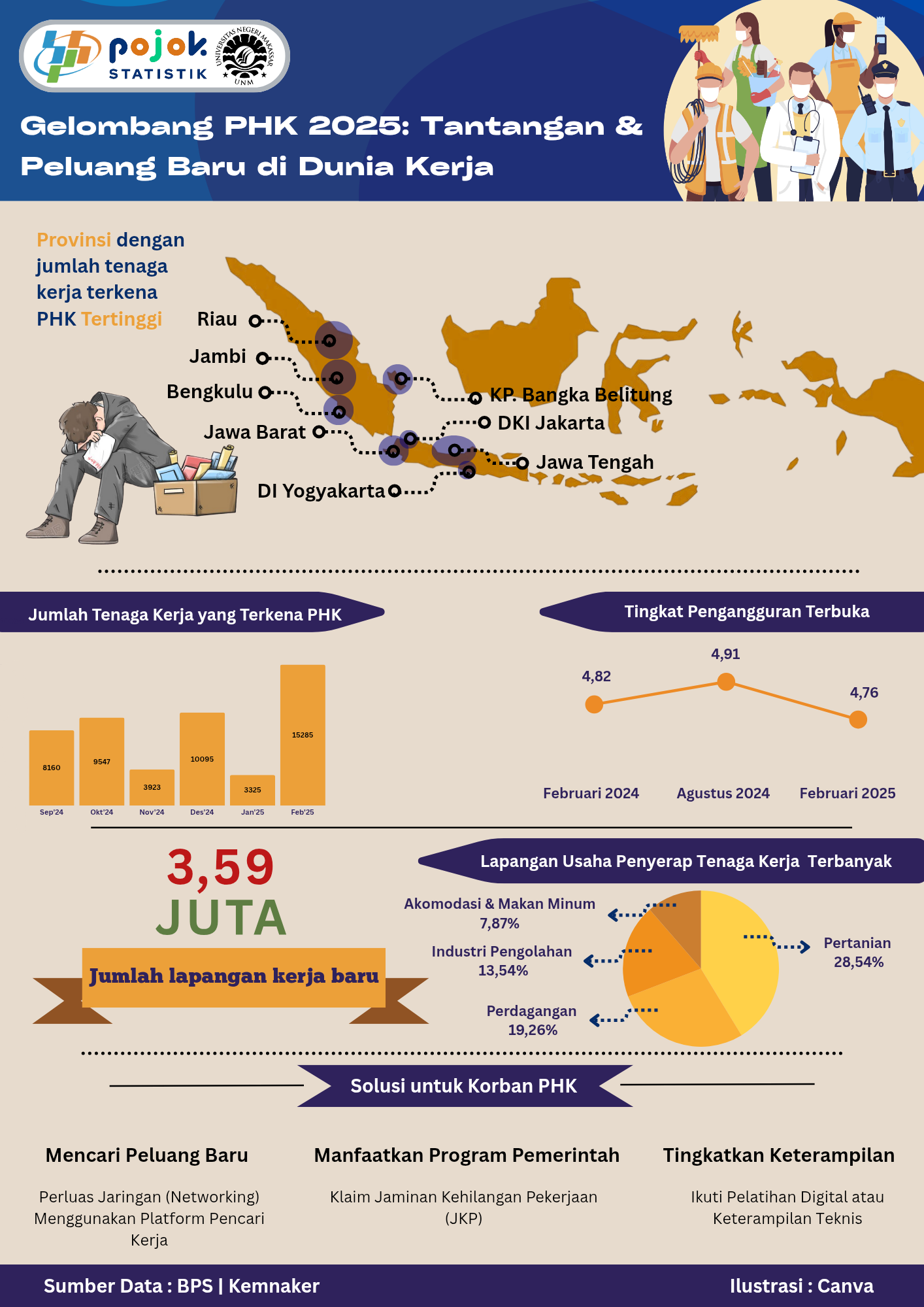 Tahun 2025, tercatat 3,59 juta lapangan kerja baru hadir, meski gelombang PHK meningkat di beberapa provinsi seperti Riau, Jambi, hingga DKI Jakarta. Sektor pertanian (28,54%)...
