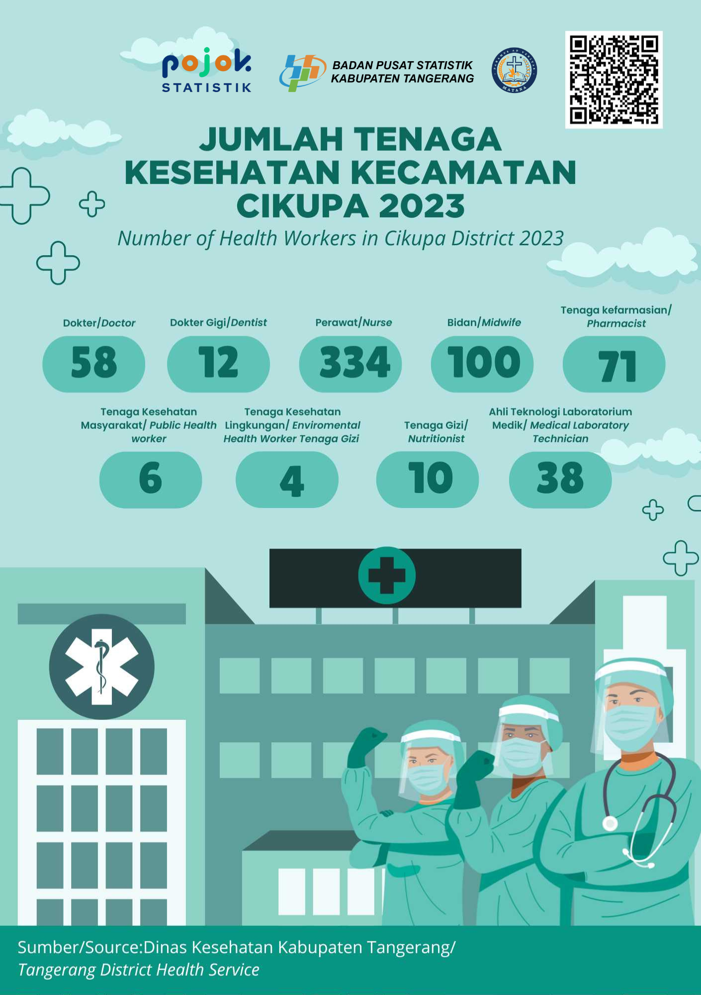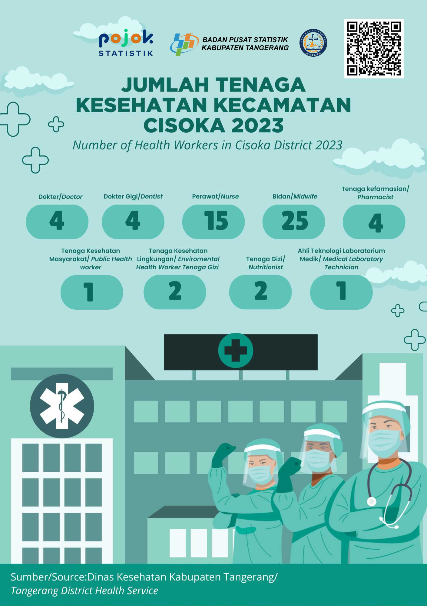 Pada tahun 2023, Jumlah Tenaga Kesehatan di kecamatan Cisoka sebanyak 58 orang, terdiri dari 4 dokter umum, 4 dokter gigi, 15 perawat, 25 bidan, 4...